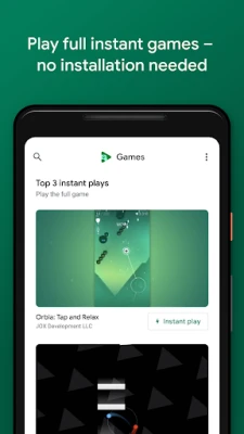 KEY FEATURES • Instant play: There’s no installation needed – look for the "Instant play" button to instantly play full games. • Built-in Google games: Play Solitaire, Minesweeper, Snake, PAC-MAN, Cricket, and Whirlybird – even when you’re offline. • Save your progress: Your progress is automatically saved to the cloud when you see "Progress saved by Play Games." • Gamer profile: Create a custom gamer ID, unlock achievements, earn XP, and level up. • Gameplay recording: Easily record and share your best gameplay moments.