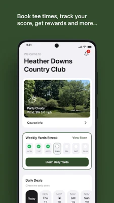 Get the Heather Downs Country Club app to conveniently reserve your tee times, track your score, and view our course social feed. Booking is fast and easy with just a few taps. Look up your reservations at any time or view and redeem your rewards or promotion codes.
