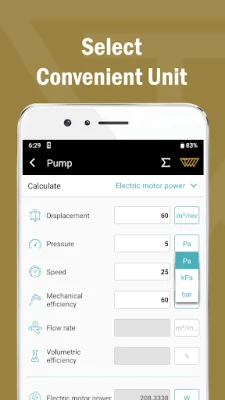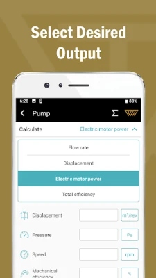 - The app enables the calculation of displacement, flow rate, electric motor power and total efficiency in Pump section