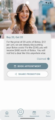 Within the Model Rewards app, each patient is assigned a unique Referral Code. The patient Referral Code can be sent to friends by playing 'The Referral Game', where patients can win points once their referred friends purchase services. As a second option, patients can simply provide friends their Referral Code to use at login to the Model Rewards app. The referred patient will receive points immediately upon login and the referring patient receives points once the referred patient books their first service.