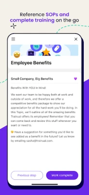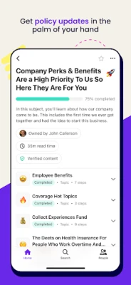 - Reference SOPs, best practices, and policies. - Ask a question in the search bar (and get an immediate answer). - Quickly access team member contact info. - Look up who does what (and how). - Catch up on training to-dos. - Take tests and e-sign training. - Get real-time updates on changes to policies and processes. - And more! Helping you stay accountable and informed — so you can carry out business processes efficiently and with 100% confidence. No matter where you are.