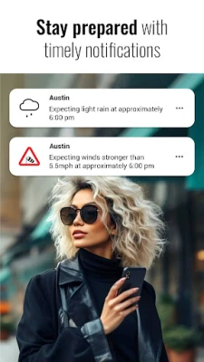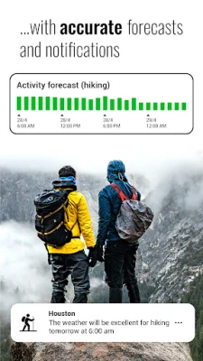 Set up custom notifications to receive alerts about high or low temperatures, strong wind, specific weather conditions, and upcoming weather that is suitable for your favorite outdoor activity.